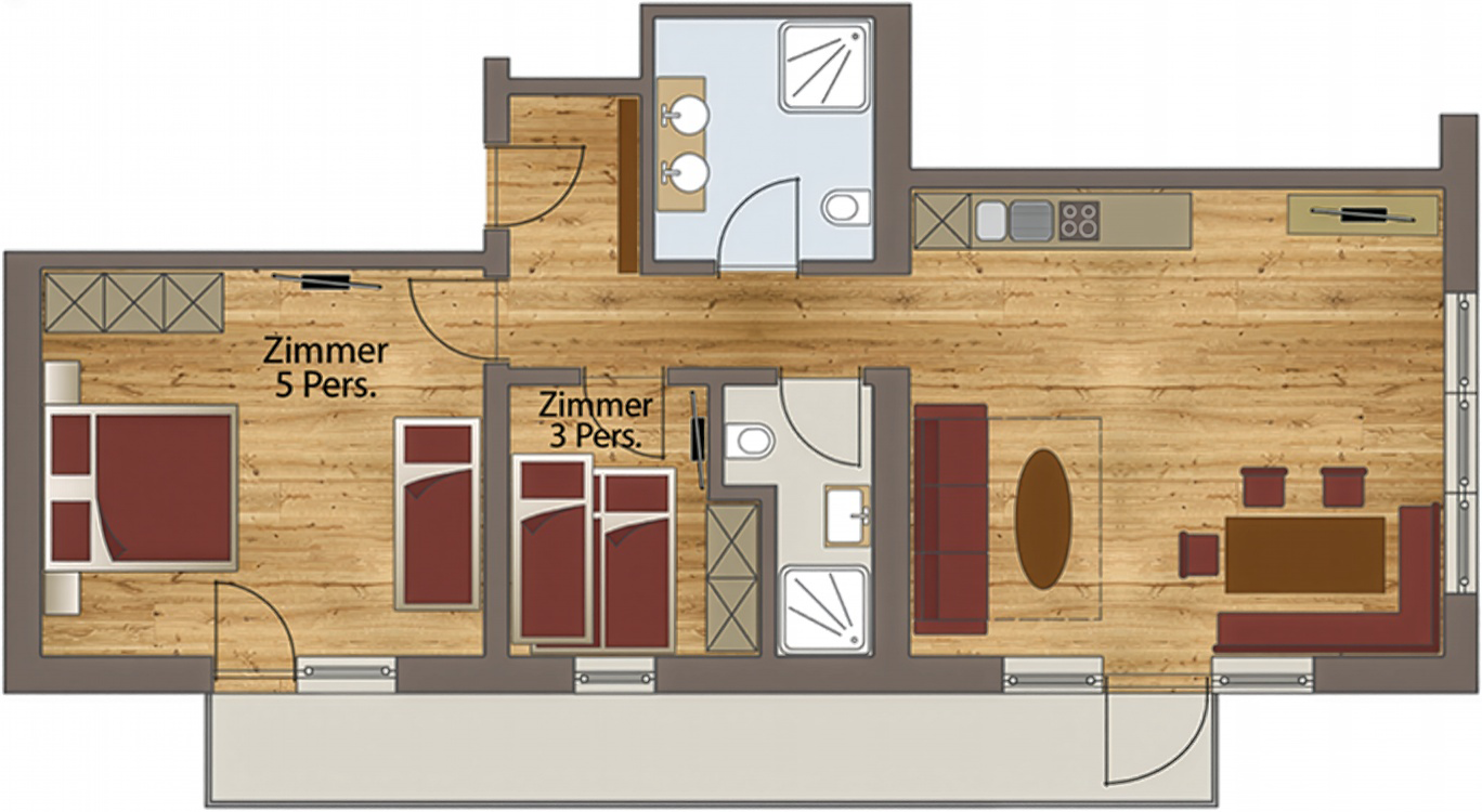 Das großzügige Appartement ist mit heimischen Materialien stilvoll und gemütlich eingerichtet. Hochwertige Schlafzimmermöbel der Marke Flexinno garantieren besten Schlafkomfort für alle Gäste. Mit komplett ausgestattetem Küchenblock, gemütlicher Essecke, 2 Schlafzimmern, 2 Bädern und einem großen Balkon erwartet Sie ein schönes, helles Appartement für einen unvergesslich erholsamen Urlaub.